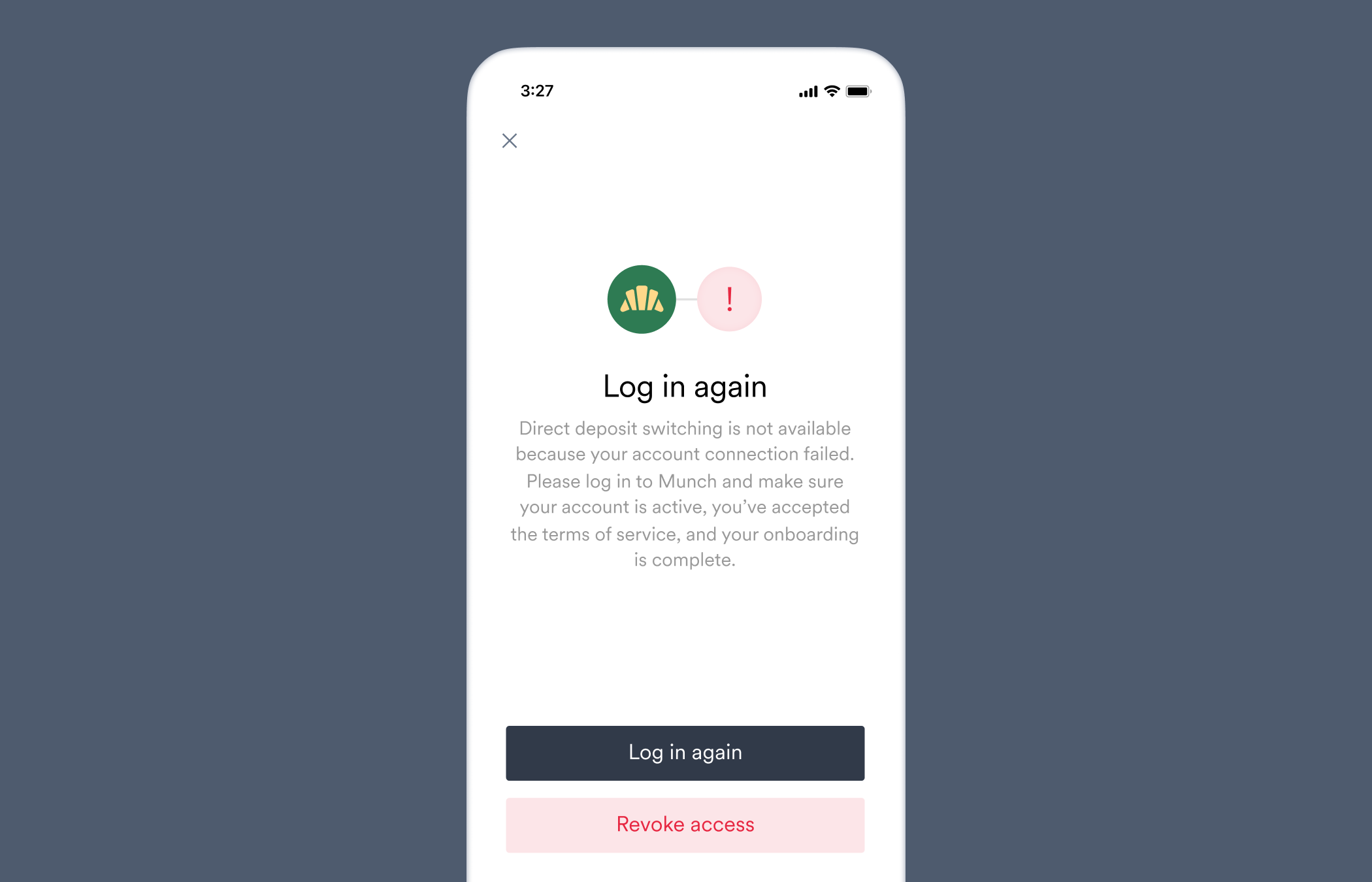 Direct deposit switching is not available because your account connection failed. Please log in to [Company name] and make sure your account is active, you’ve accepted terms of service, and your onboarding is complete.