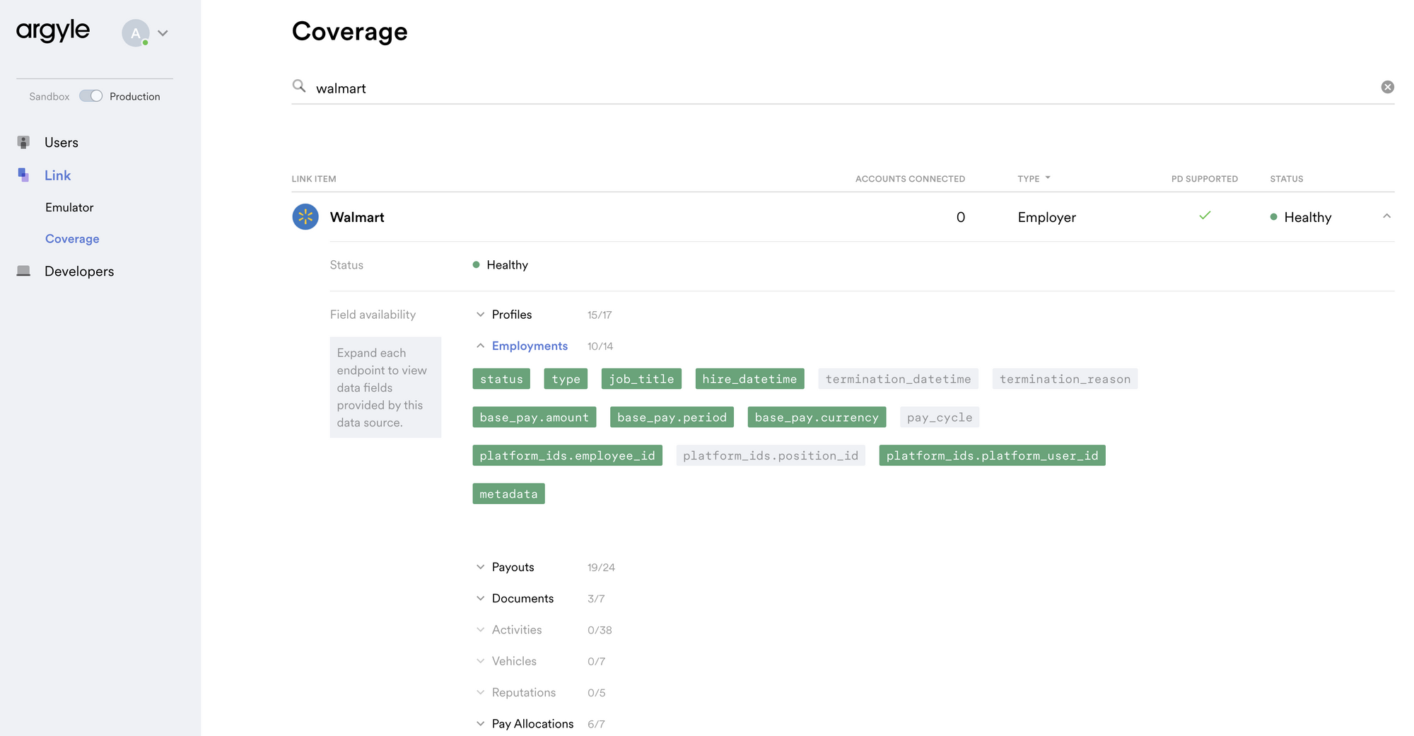 - When viewing the entire coverage through Argyle Console, use the search bar to find a company or platform and see which endpoints and data fields are available for it.