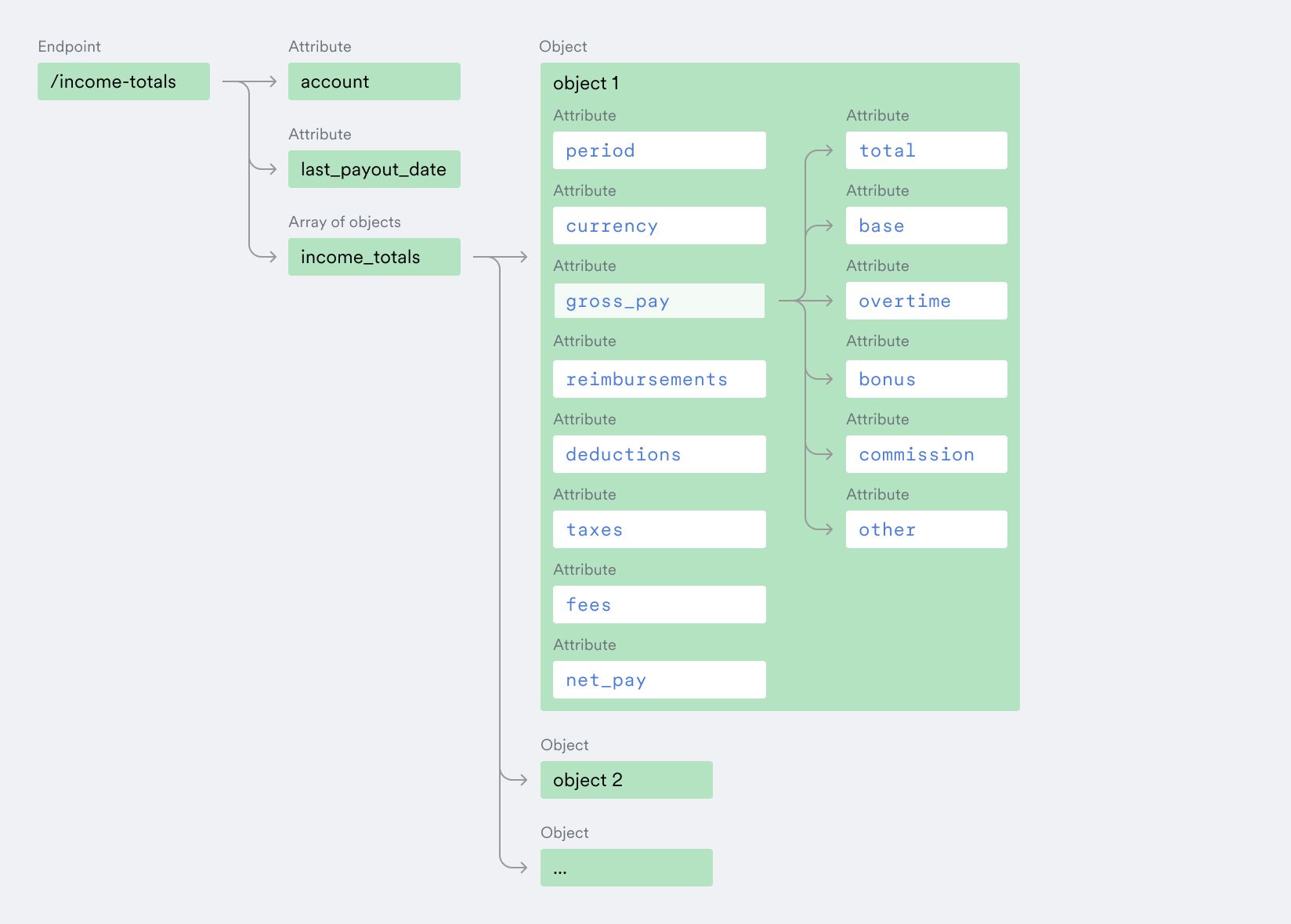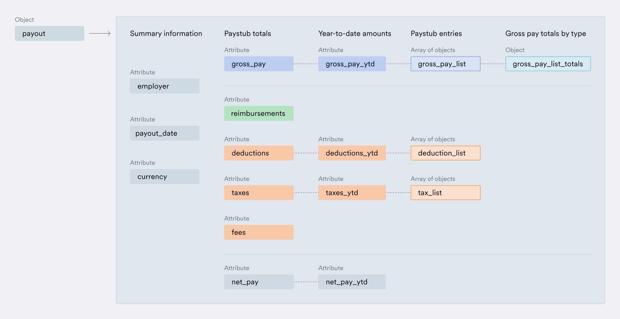 income_totals.gross_paycorresponds topayout.gross_pay_list_totals.income_totals.deductionsis based onpayout.deductionsandpayout.deductions_ytd, withincome_totals.taxesandincome_totals.net_payfollowing the same approach.income_totals.reimbursementsandincome_totals.feescorrespond topayout.reimbursementsandpayout.fees, respectively.