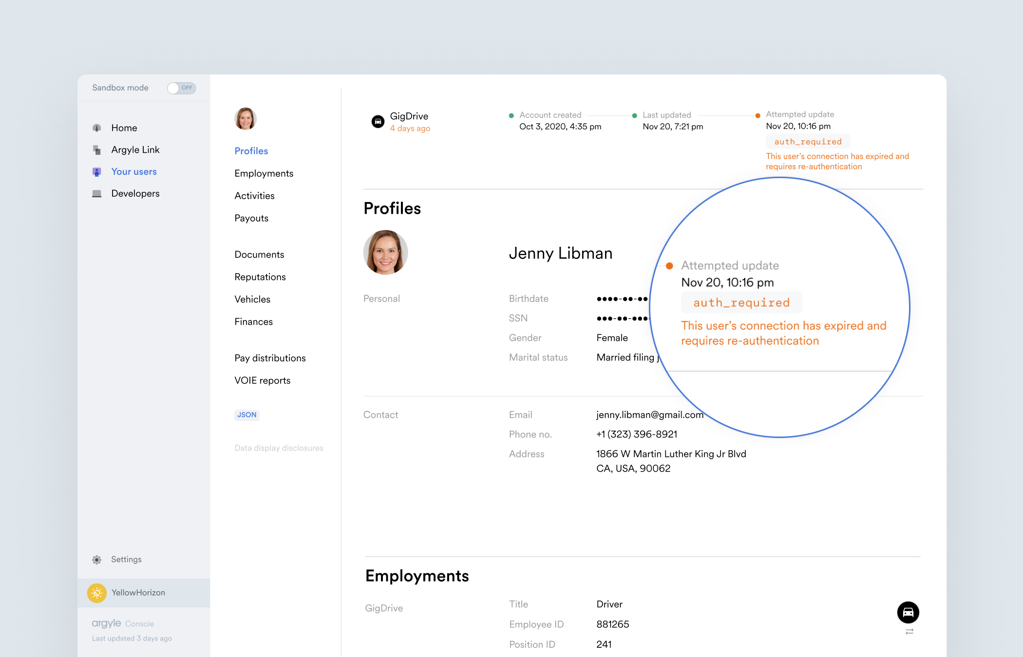 The status of a borrower’s connected payroll accounts is shown at the top of the borrower’s profile page in Argyle Console. The account object’s connection status can also be retrieved using Argyle’s API. If a borrower’s payroll account has become disconnected, they can be deep-linked directly to the disconnected account for re-connection, ensuring their information is up-to-date.Notifications for changes