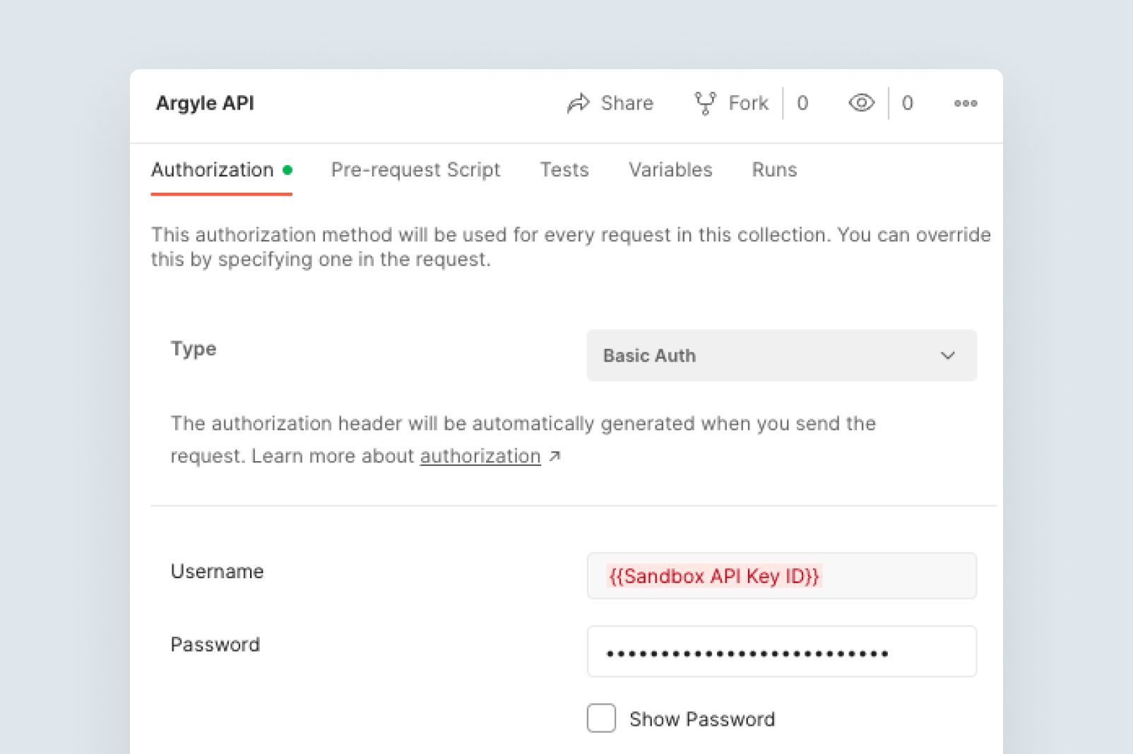 Sandbox API Key ID. - Replace the password field on Postman’s authorization page with your