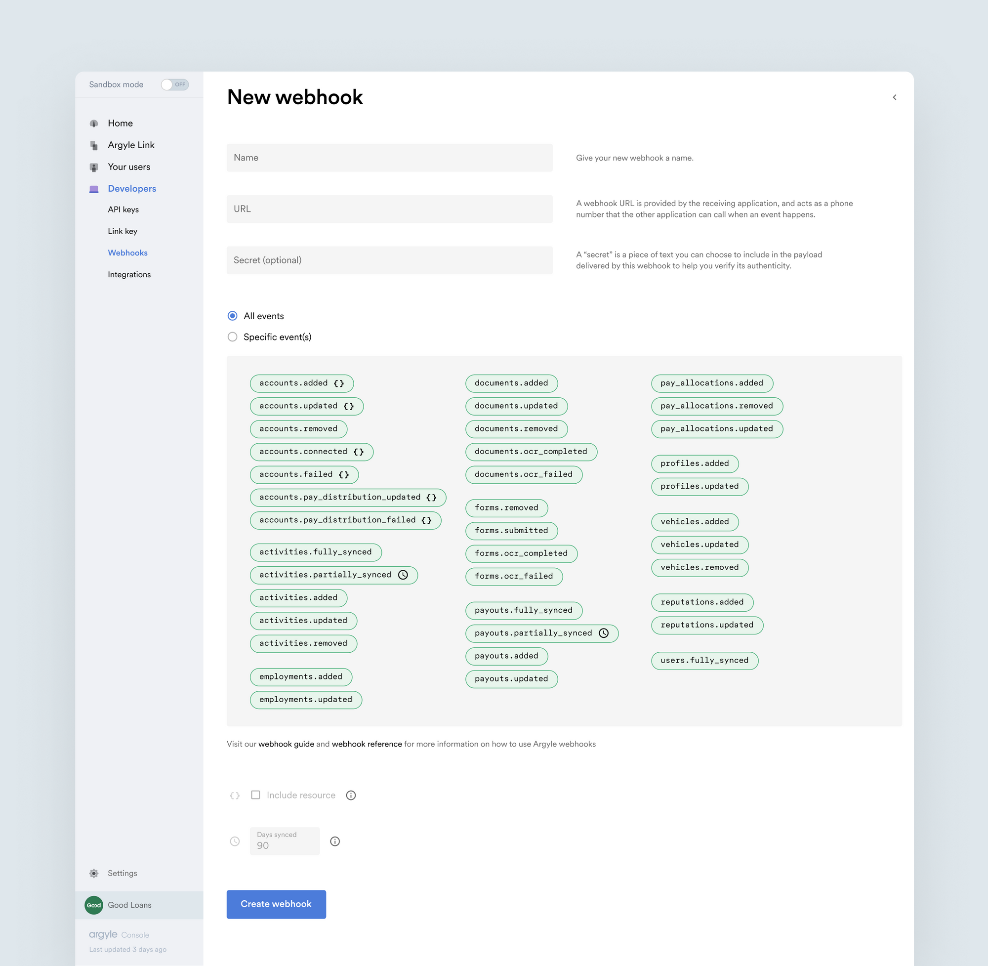 The webhook events you subscribe to are delivered for all accounts. Each time a new account is connected or an existing one is updated, a corresponding webhook will notify your system.- You can subscribe to webhooks by sending a POST request to Argyle’s webhooks endpoint with the event name you want to subscribe to. This Webhooks reference contains the list of examples for all webhook subscription calls.