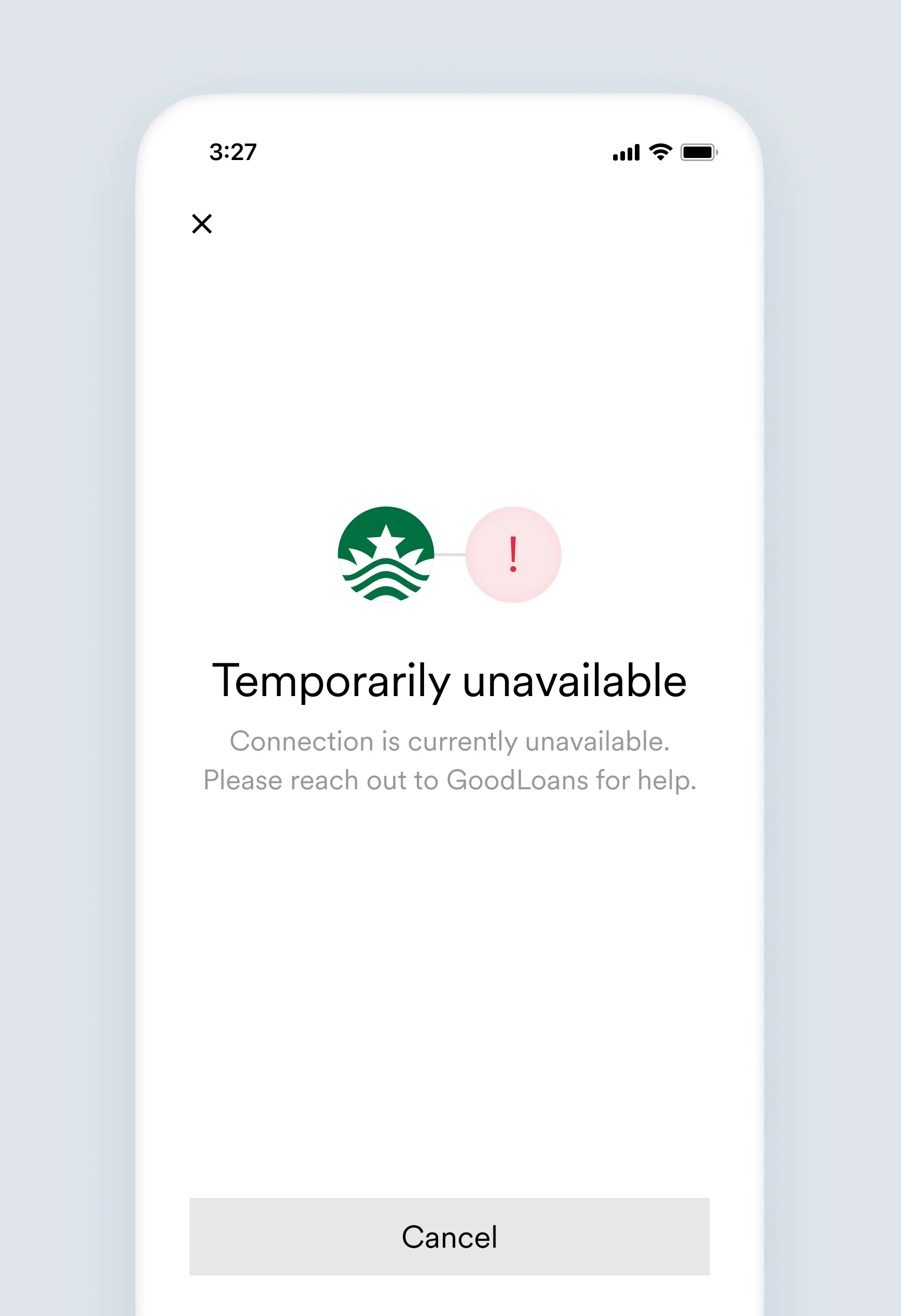 Some error messages shown to the user have placeholders for [Link item name] and [Company name]. In such cases, for the screens samples below, they were replaced by Starbox and GoodLoans, respectively.