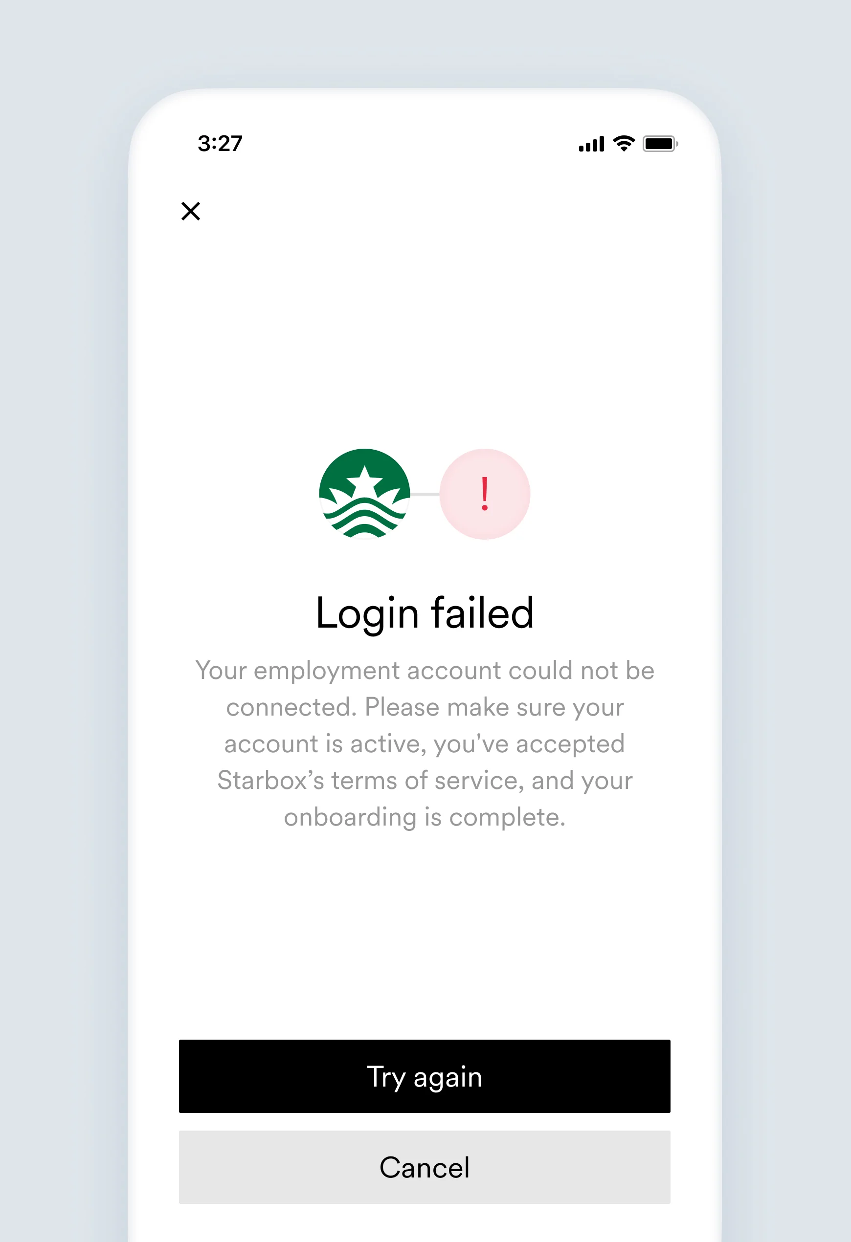 Your employment account could not be connected. Please make sure your account is active, you’ve accepted [Link item name] terms of service, and your onboarding is complete.