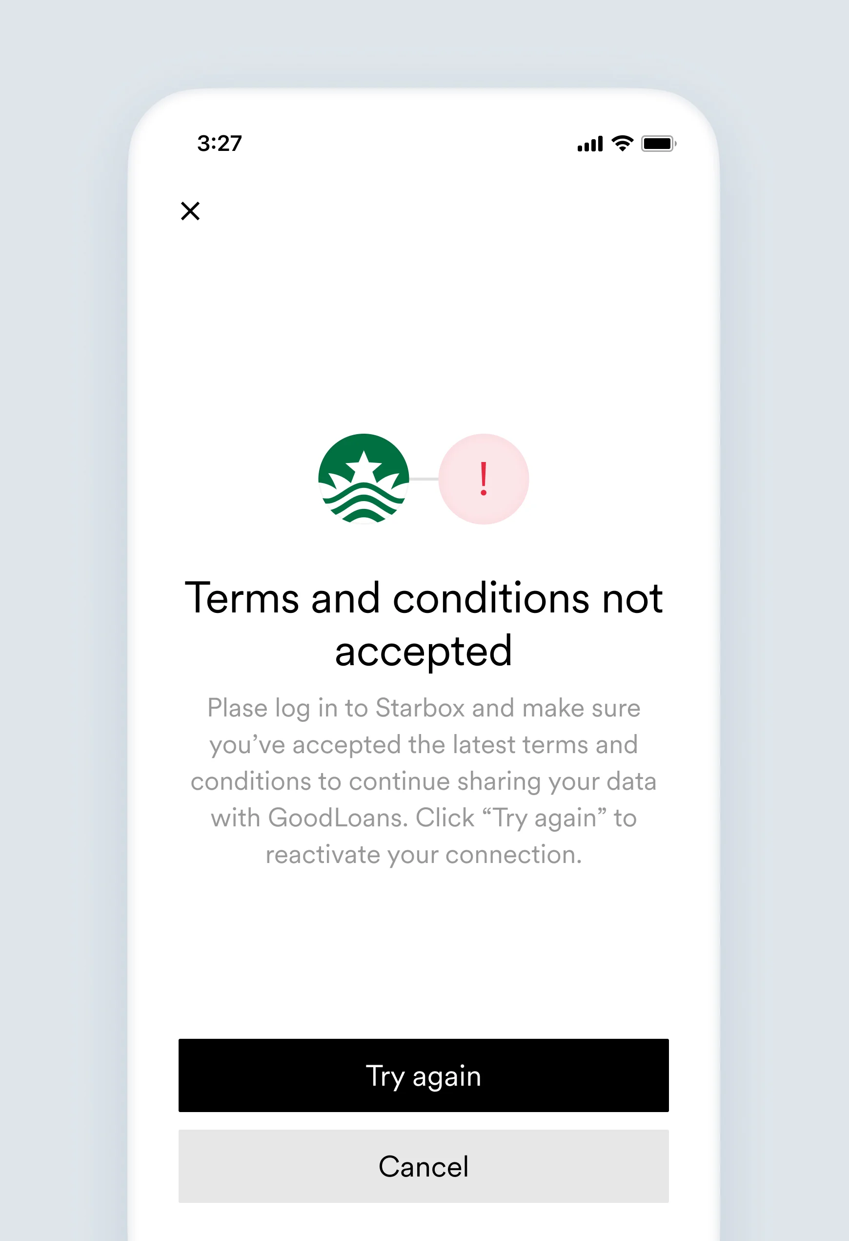 Please log in to [Link item name] and make sure you’ve accepted the latest terms and conditions to continue sharing your data with [Company name]. Click try again to reactivate your connection.