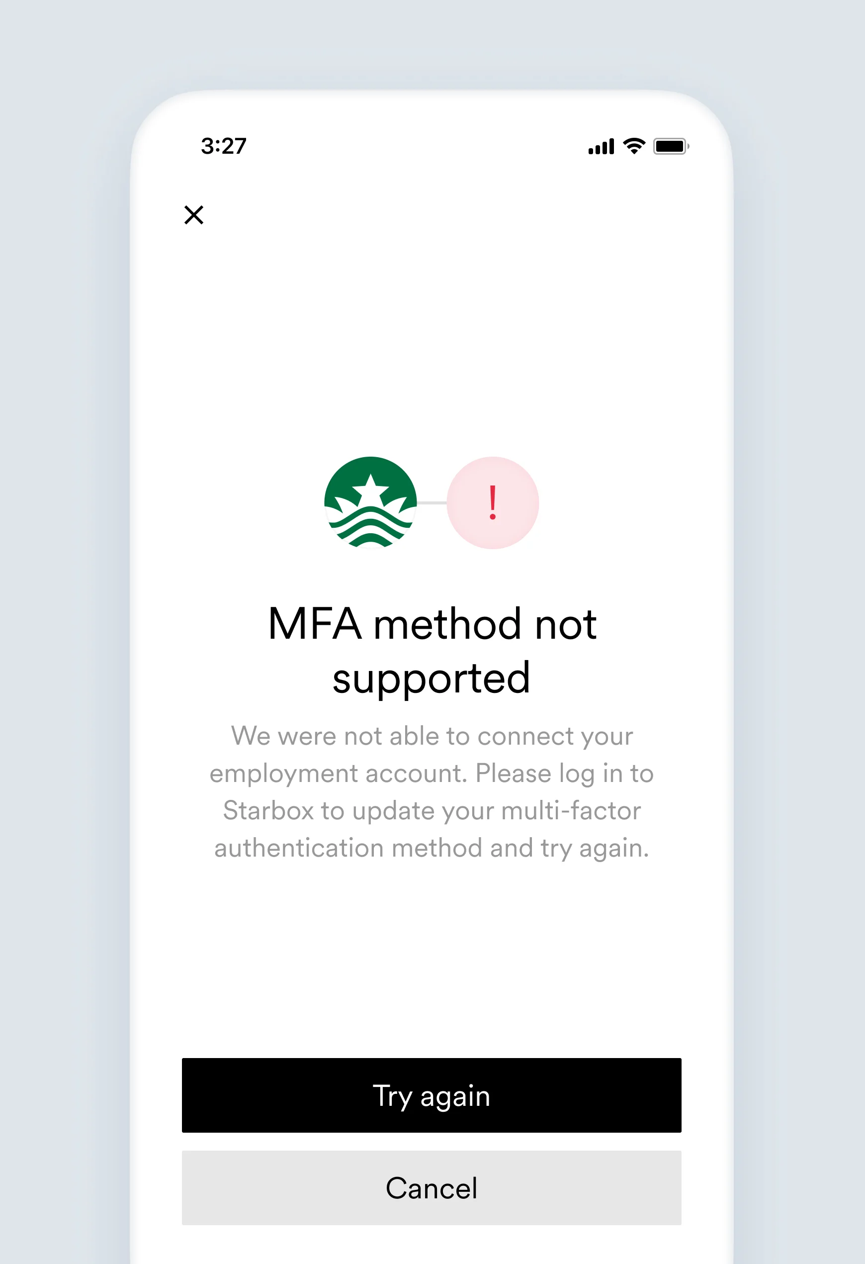 We were not able to connect your employment account. Please log in to [Link item name] to update your multi-factor authentication method and try again.
