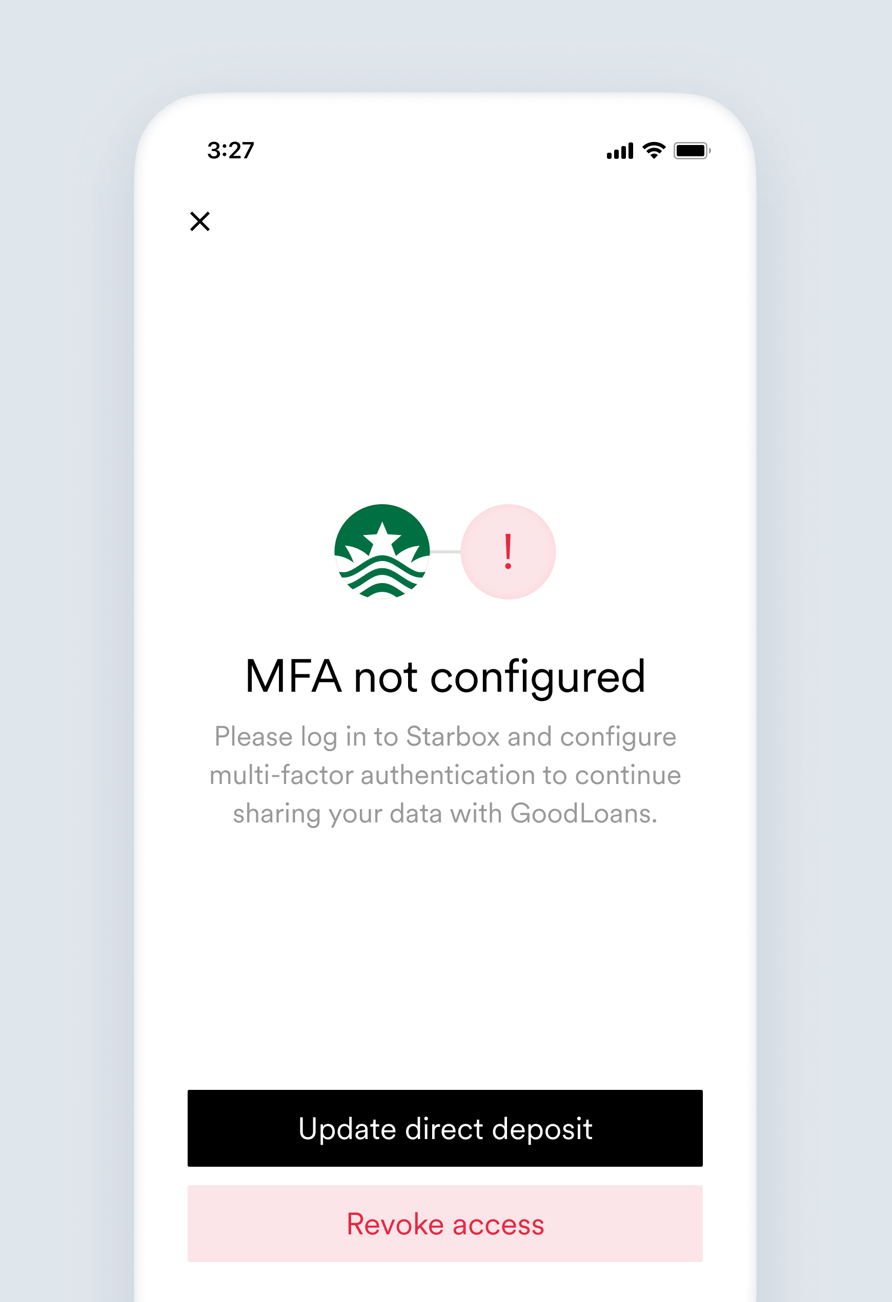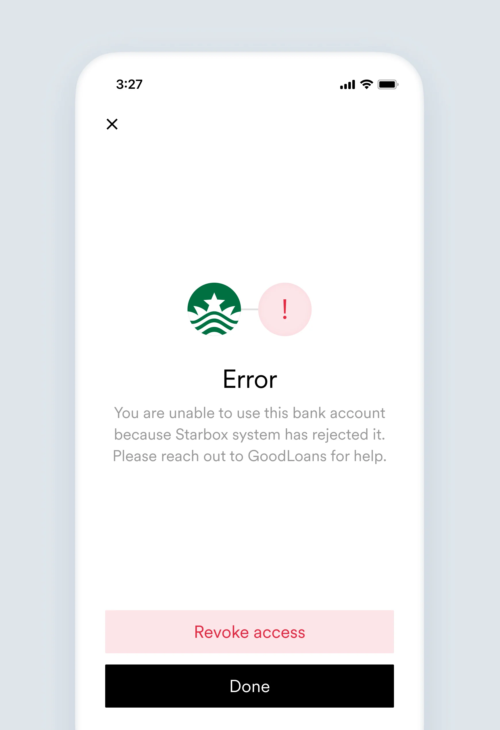 Some error messages shown to the user have placeholders for [Link item name] and [Company name]. In such cases, for the screens samples below, they were replaced by Starbox and GoodLoans, respectively.