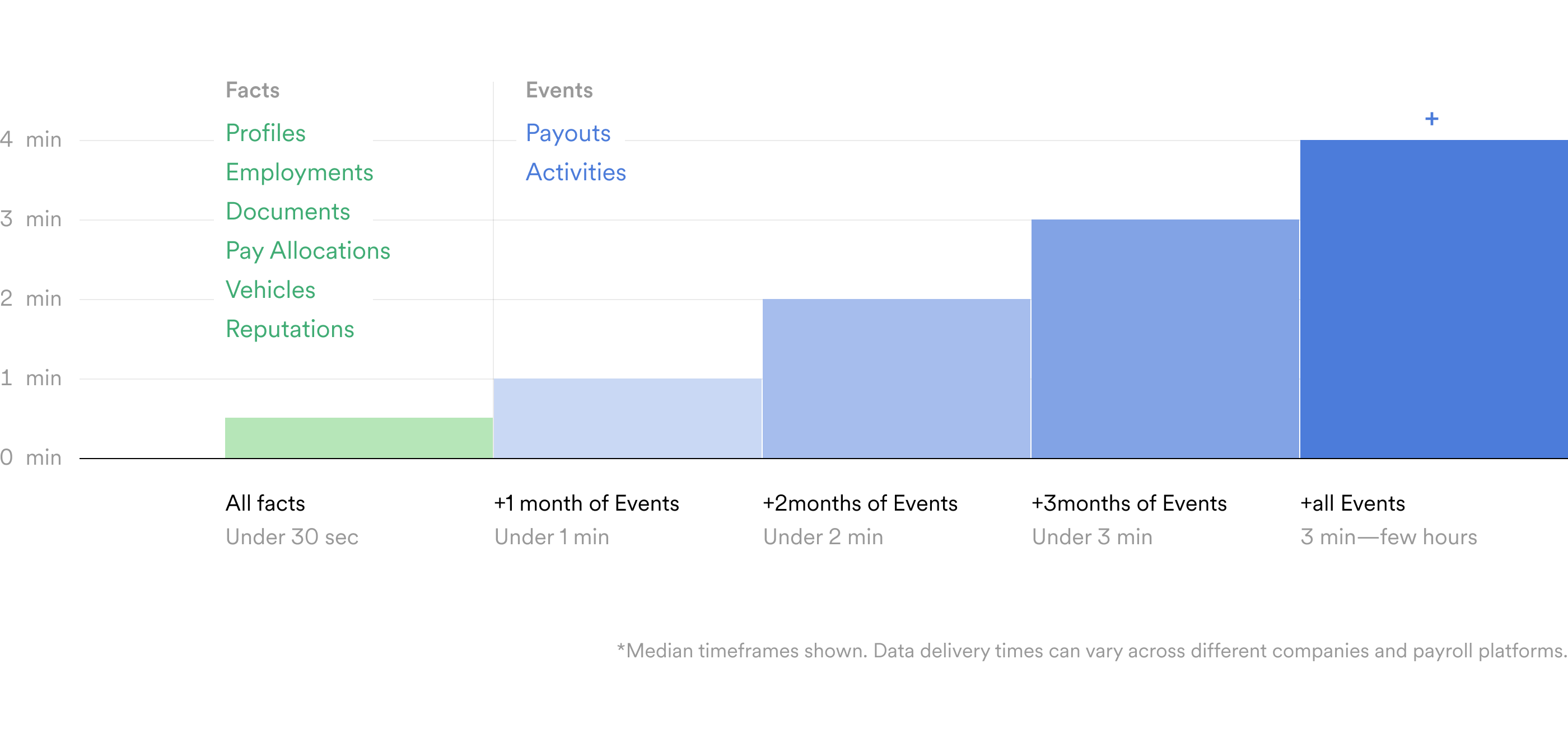 Not all data is created equally. Employment information as job title or profile information as name are quite stable and usually can be retrieved very quickly. However, paystub information requires more time to download and scan PDF files. Please refer to the diagram below to inform your decisions on data retrieval times:Paycheck-linking