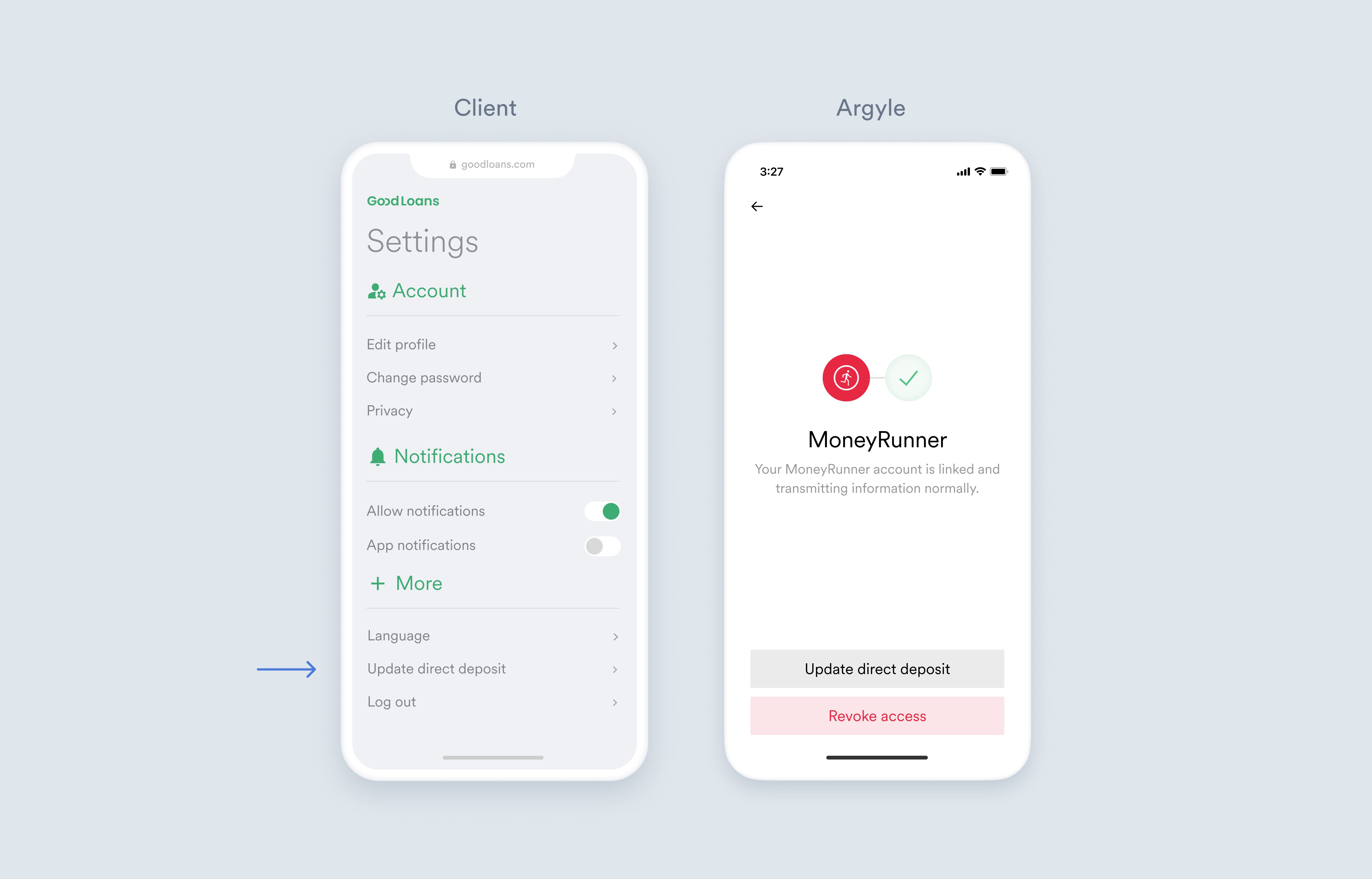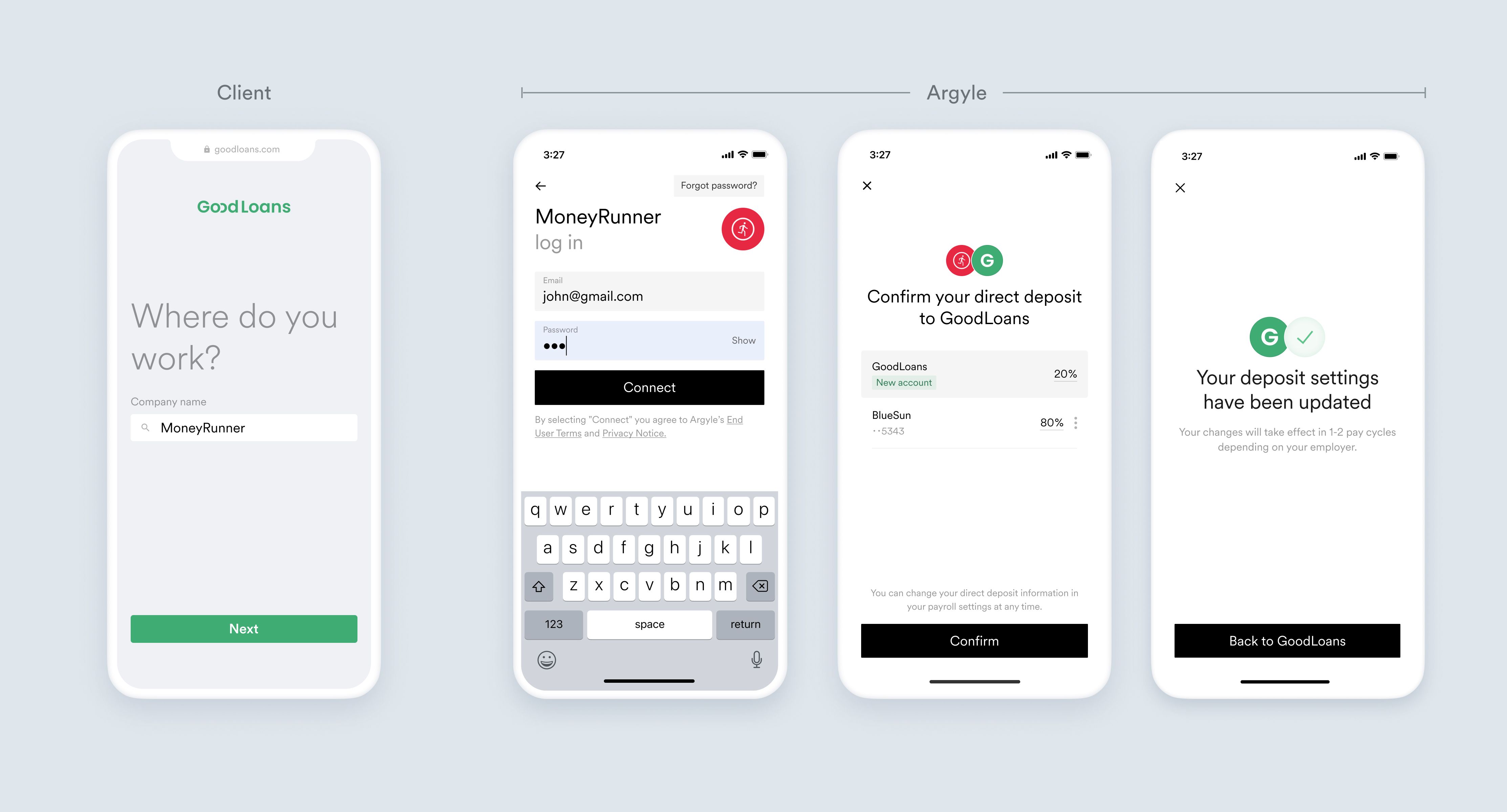 After making a loan decision and having the users accepted loan terms, drop the users back into Argyle to link their paychecks to the payback of the loan. Users have to confirm a regular and automated pay allocation to the financial institution of your choice. If you are using the recommended flow, the users do not need to re-authenticate with their payroll platform to link their paychecks. Argyle maintains an active session and can drop the users directly into the direct deposit switching screen:- Incentive - users need to clearly understand why they are setting up paycheck-linked payments and the benefits of this. It can include hard benefits (i.e. cash rewards), or soft benefits (FDIC insurance, interest, etc).