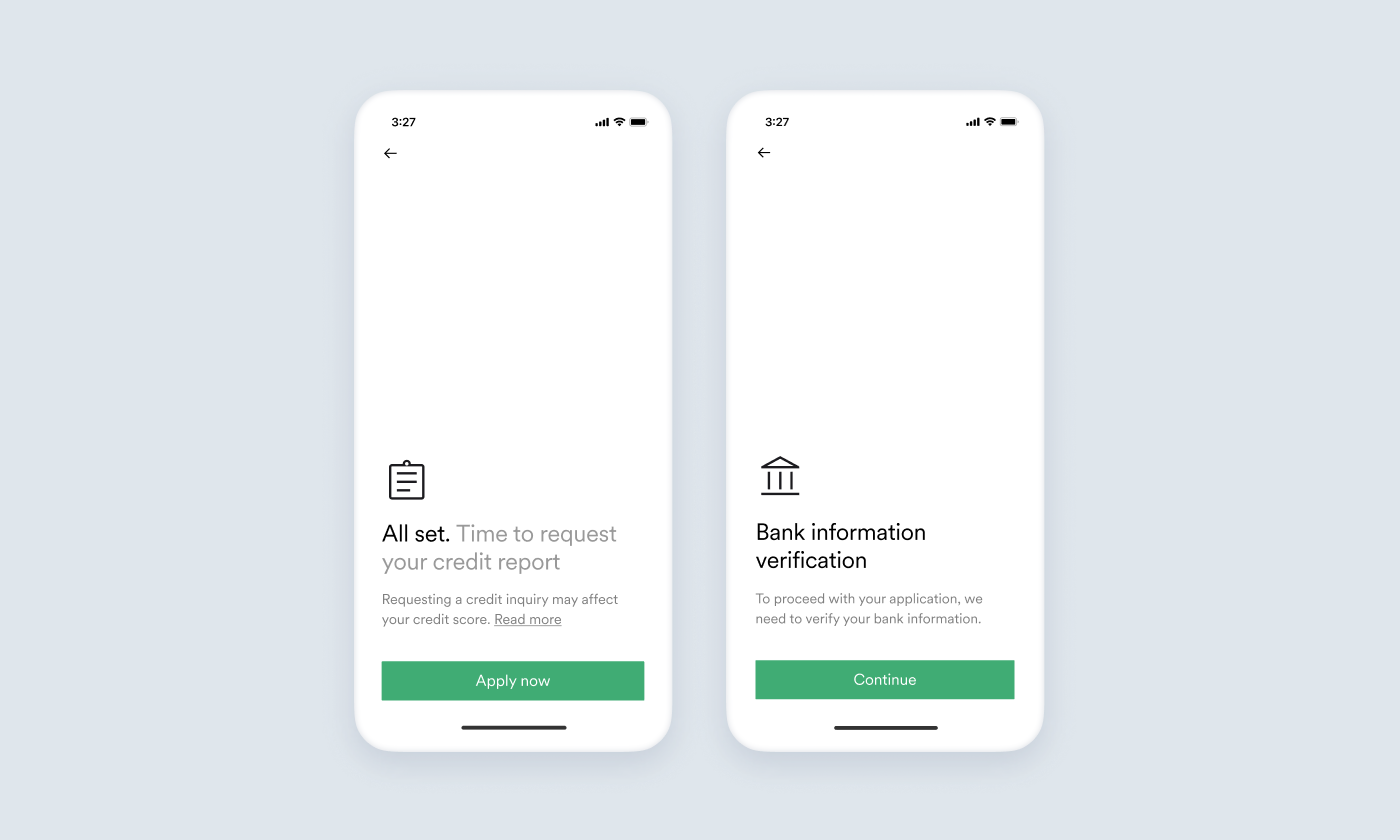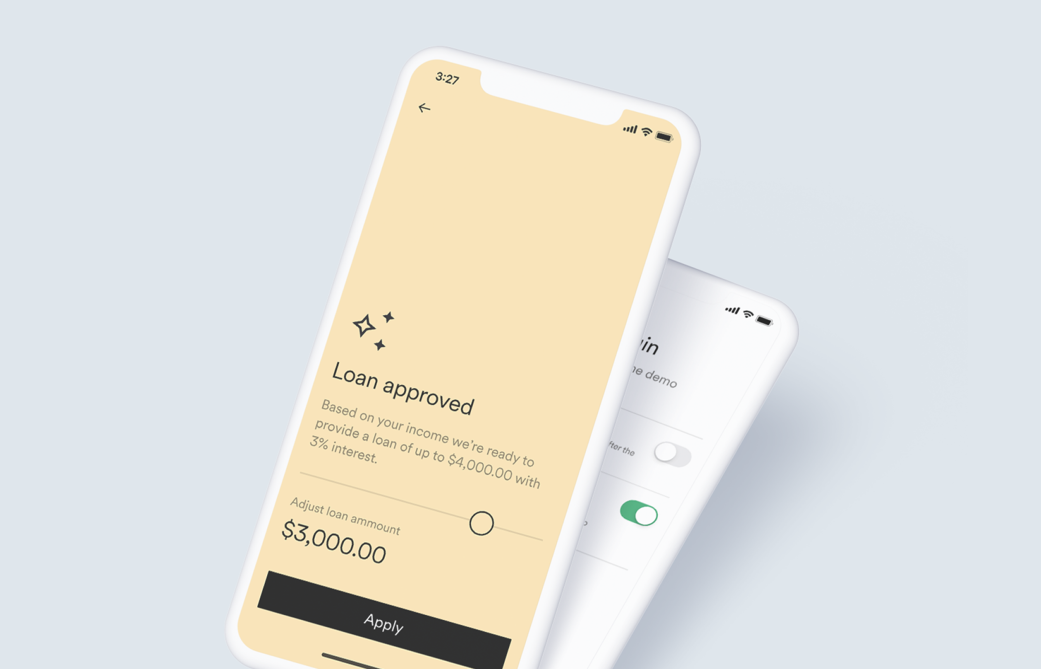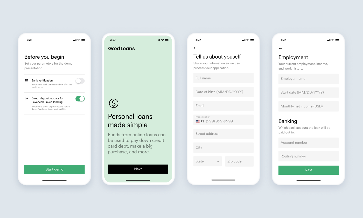 After opening Loan App, an initial settings screen allows for customizing the application experience. Enabling “bank verification” will add a step to the application showing how you could invite borrowers to connect their bank accounts for further verification. Enabling “direct deposit update for paycheck-linked lending” will allow the loan applicant to direct a portion of their paycheck to their new loan provider.Skip ahead