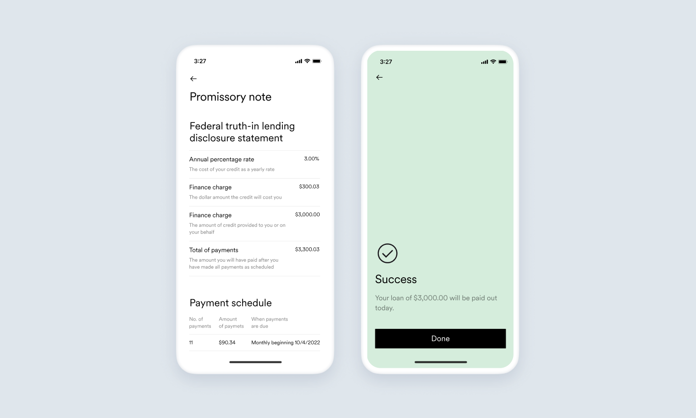 Once a loan applicant’s employment account has been connected and their paycheck allocation has been set, a standard contract example and completion page are shown.Next steps